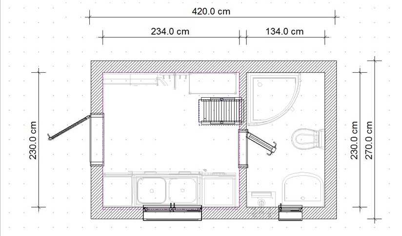 Минимальные размеры бытовки с душем и туалетом — 4*,5 м