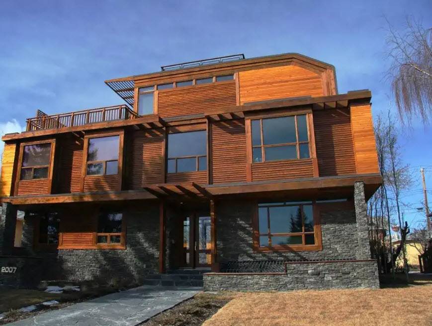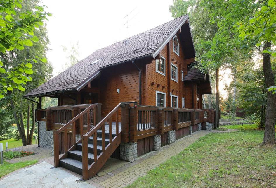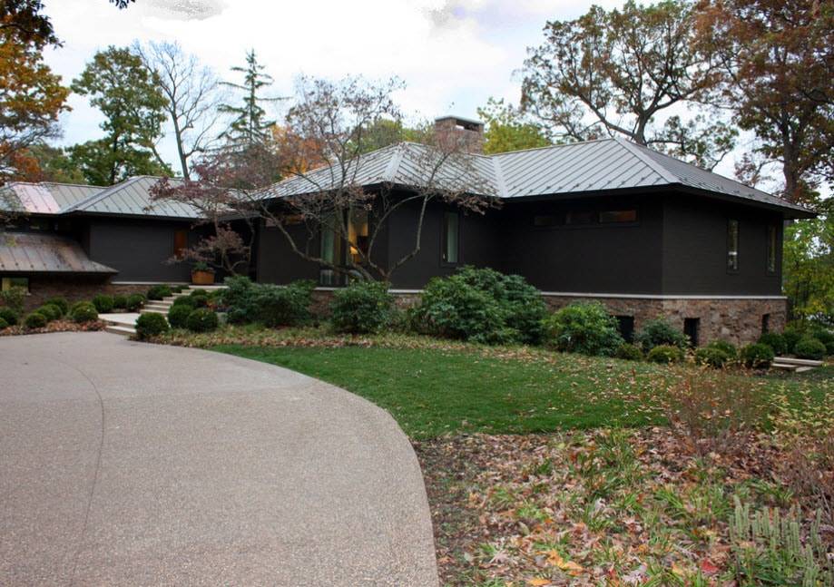 - Для облицовки цоколя лучше всего использовать темные тона, так как эта часть здания постоянно и больше всего загрязняется во время эксплуатации. Что касается кровли, то здесь лучше отдать предпочтение более светлым оттенкам, а фасад при этом может быть контрастным, главное, чтобы выбранный цвет хорошо сочетался с крышей и цоколем.