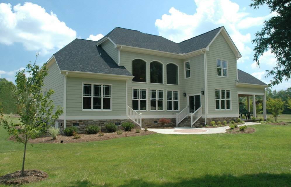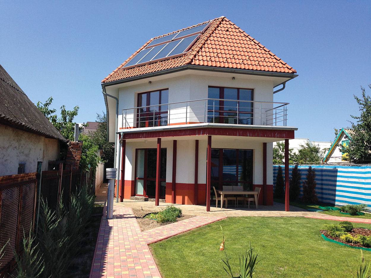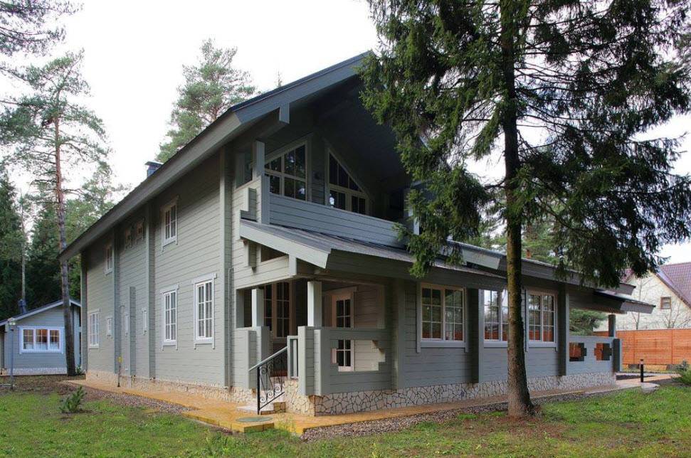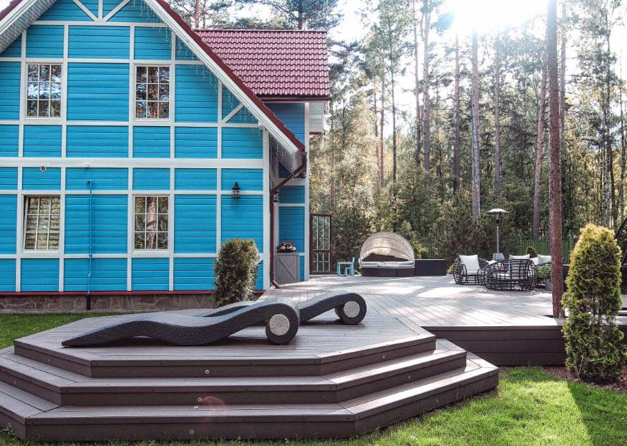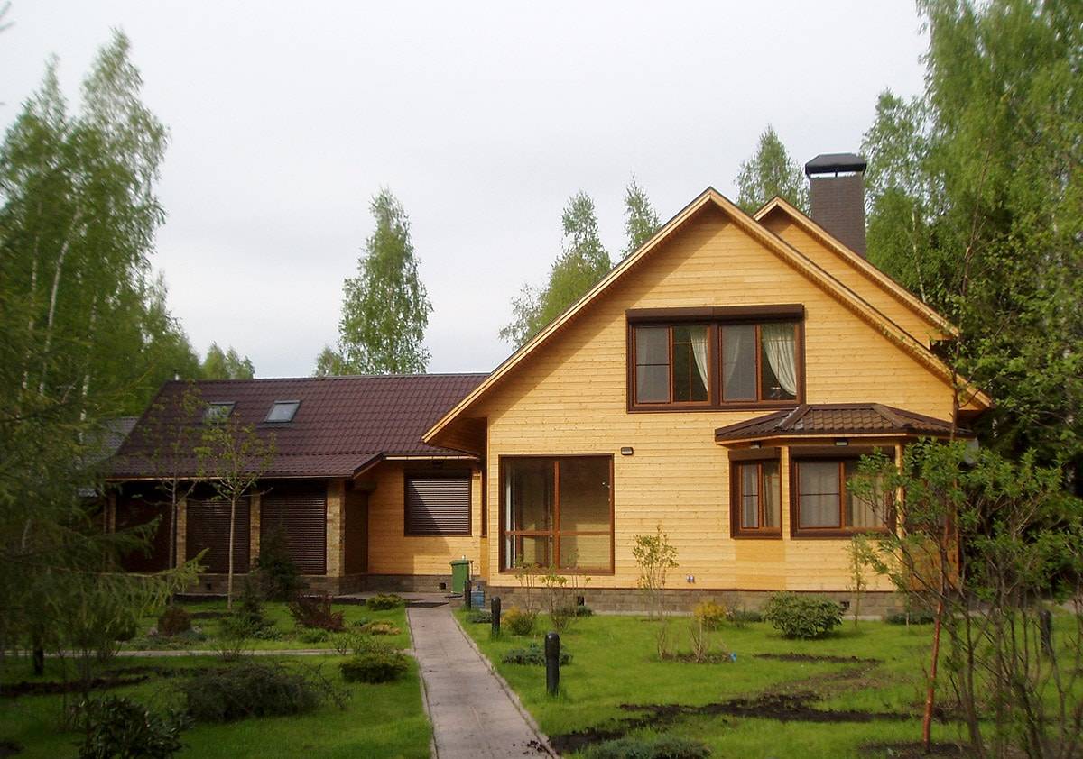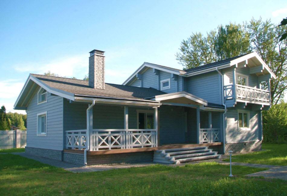 - При выборе цветовой гаммы для окрашивания фасада частного дома необходимо выбирать по яркости и насыщенности что-то среднее между цветом кровельного материала и цокольной части постройки.