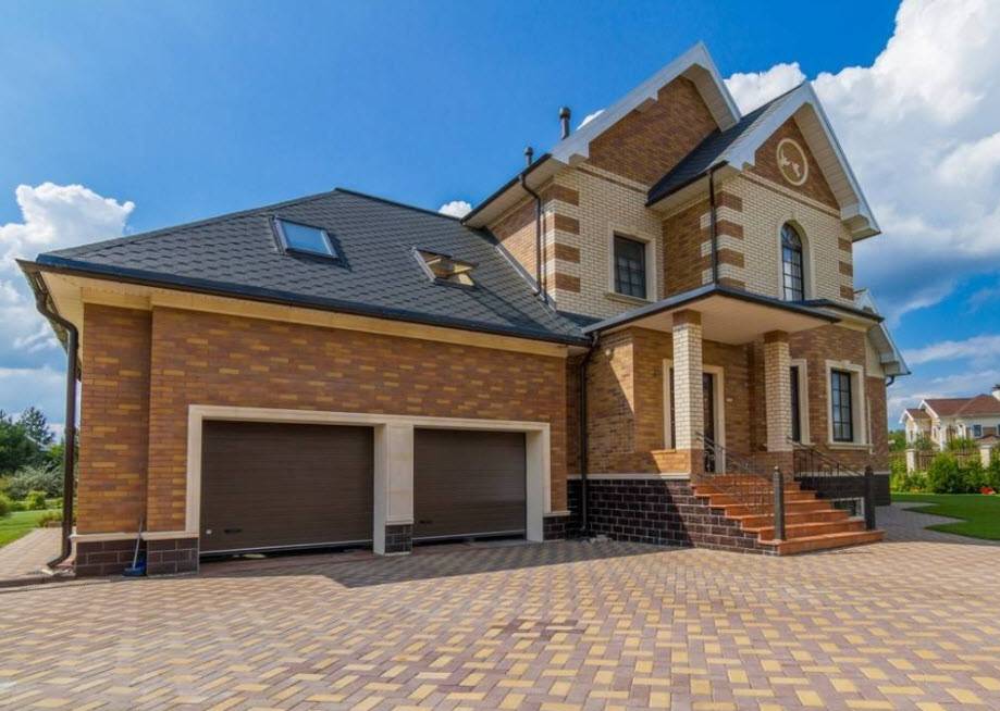 Материал обладает надежностью, устойчив к проникновению влаги в стену. Основной плюс – универсальность кирпича, большой выбор (керамический, пустотелый, щелевой, гиперпрессованный) в различной цветовой гамме. Можно сделать в едином стиле со стенами дома.