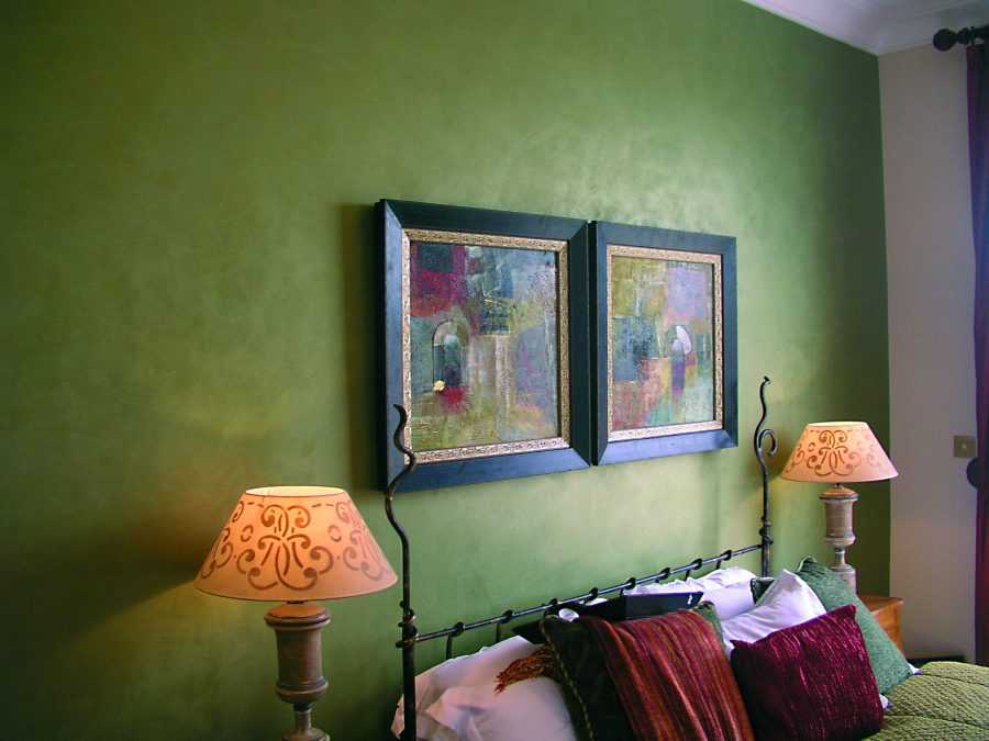 Оригинальным вариантом является акцентирование одной стены или ее части оригинальным ненавязчивым рисунком, который будет недалек от основного фона. Для пола подбирать лучше более темные, но сочетающиеся по цвету со стенами тона. Из материалов лучше использовать паркет, ламинат, дерево.
