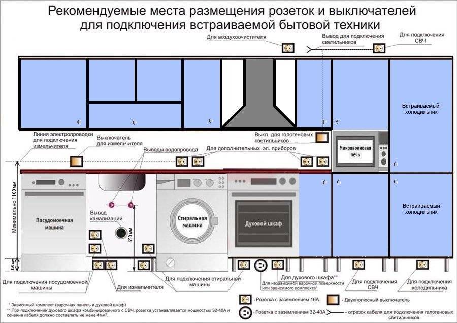 Разводку электросети выполняют, учитывая количество регулярно используемых приборов. Лидером в этом отношении является кухня, где набор техники порой напоминает небольшой магазин.