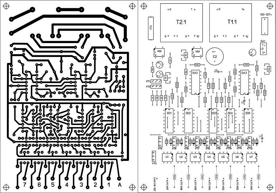 Собранный самостоятельно стабилизатор напряжения на 220 вольт будет соединять обмотки 2-го трансформатора, если уровень напряжения входа достигнет соответственно: 190, 210, 230, 250 вольт. Чтобы сделать такой стабилизатор, необходима печатная плата 115 х 90 мм, изготовленная из фольгированного стеклотекстолита.