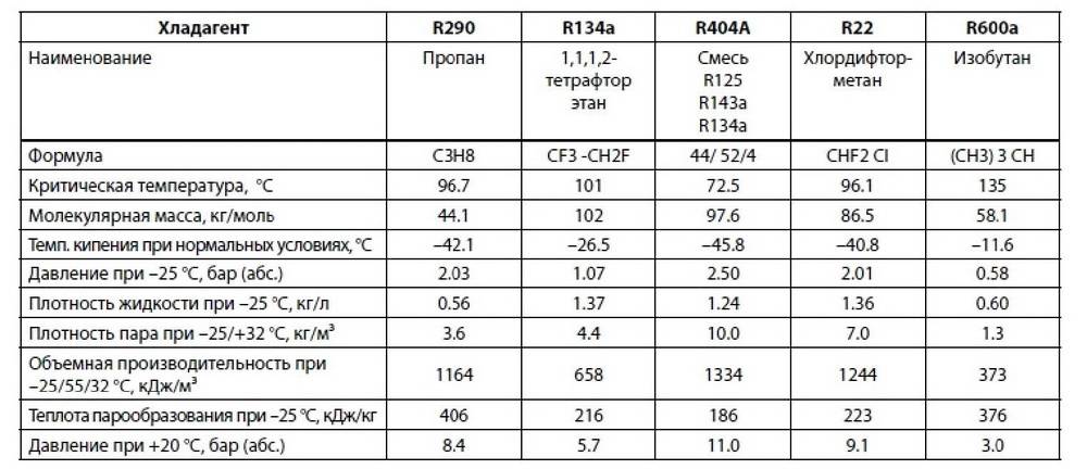 Таблица свойств позволяет выбрать оптимальный вид хладагента. Она отражает основные свойства фреонов: температуру кипения, теплоту парообразования, плотность.