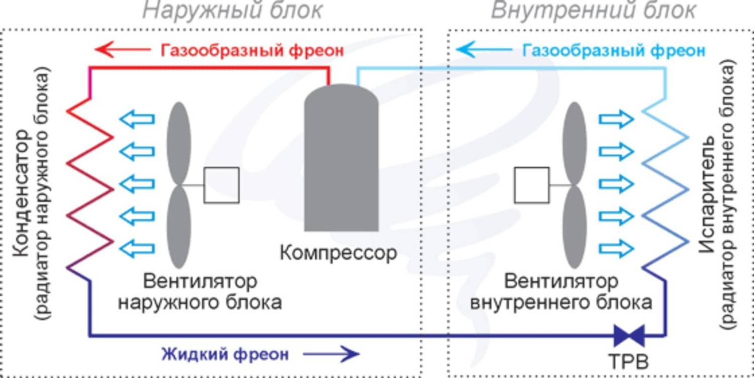 Например, при включенном режиме охлаждения кондиционирующее устройство работает на отвод тепла из воздуха помещения. То есть фактически на отвод той энергии, которая выделилась в процессе охлаждения. Поэтому-то кондиционеры и состоят из внешней и наружной составляющих. Как переносчик энергии в кондиционирующих устройствах преимущественно используется фреон, являющийся специальным хладагентом.
