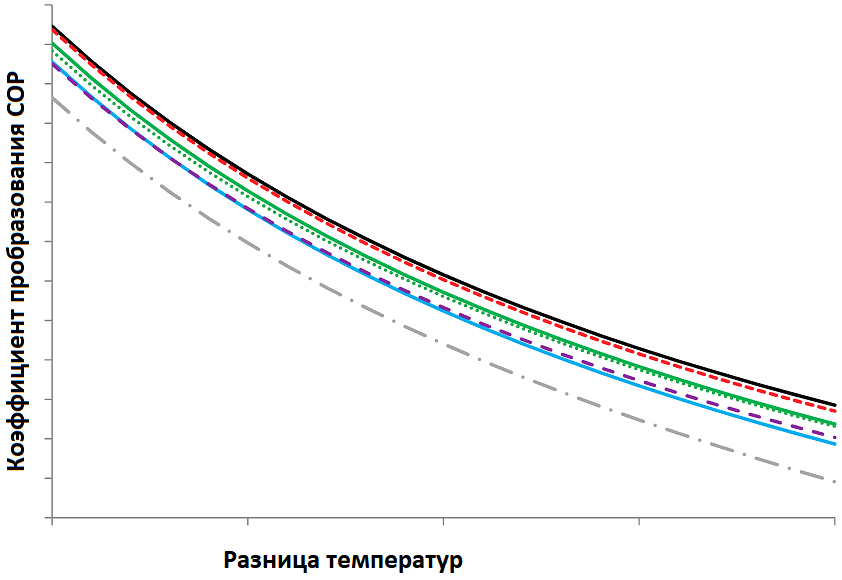 COP кондиционеров в зависимости от разницы температур в помещении и на улице.