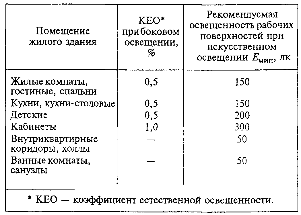 Таблица №1. Рекомендуемые нормы освещенности жилых помещений, согласно СНиП