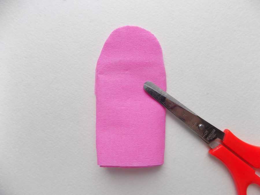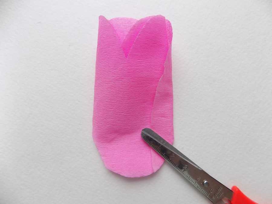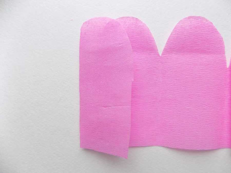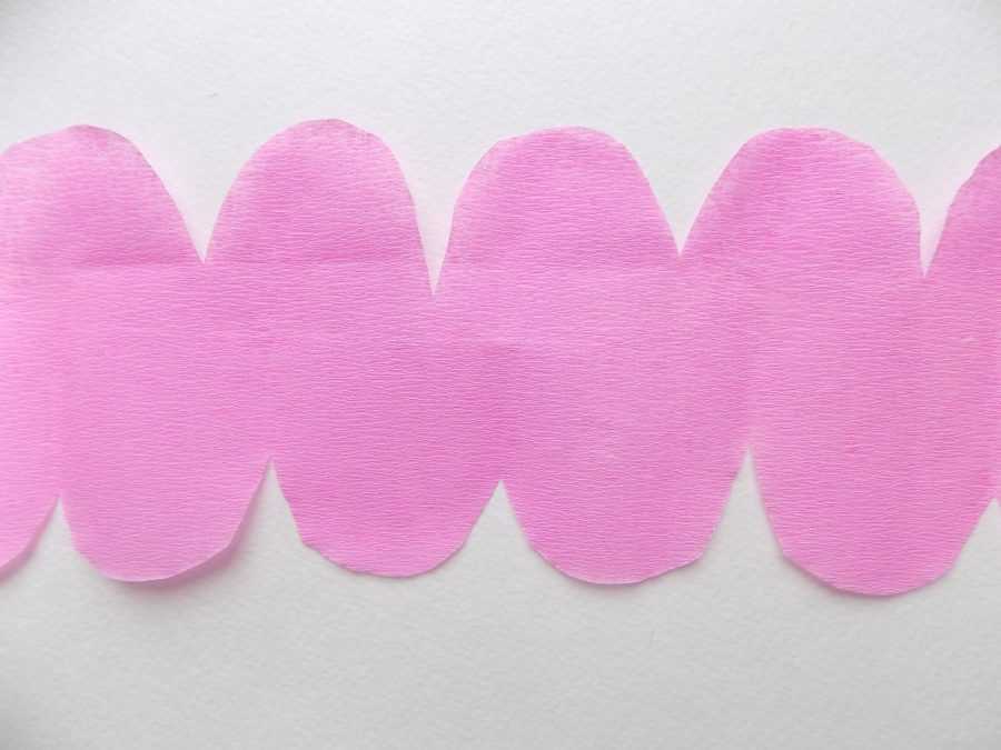 - Приложите все заготовки к бумаге и вырежьте из нее лепестки сразу в большом количестве. Лепестки следует приготовить для сборки. Для этого растяните края каждой заготовки из гофрированной бумаги, ухватив их в двух закругленных углах. Посередине лепестка пальцем сделайте выемку внутрь будущего бутона.