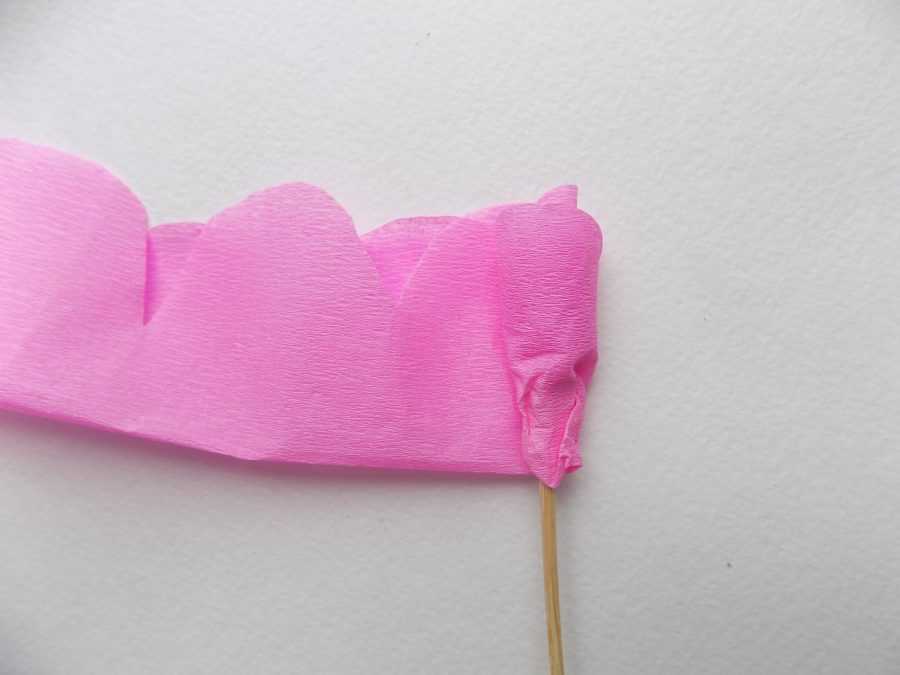 - Самым маленьким лепестком оберните проволочную сердцевину, предварительно приклеив нижнюю часть бумажной заготовки к будущему стеблю.