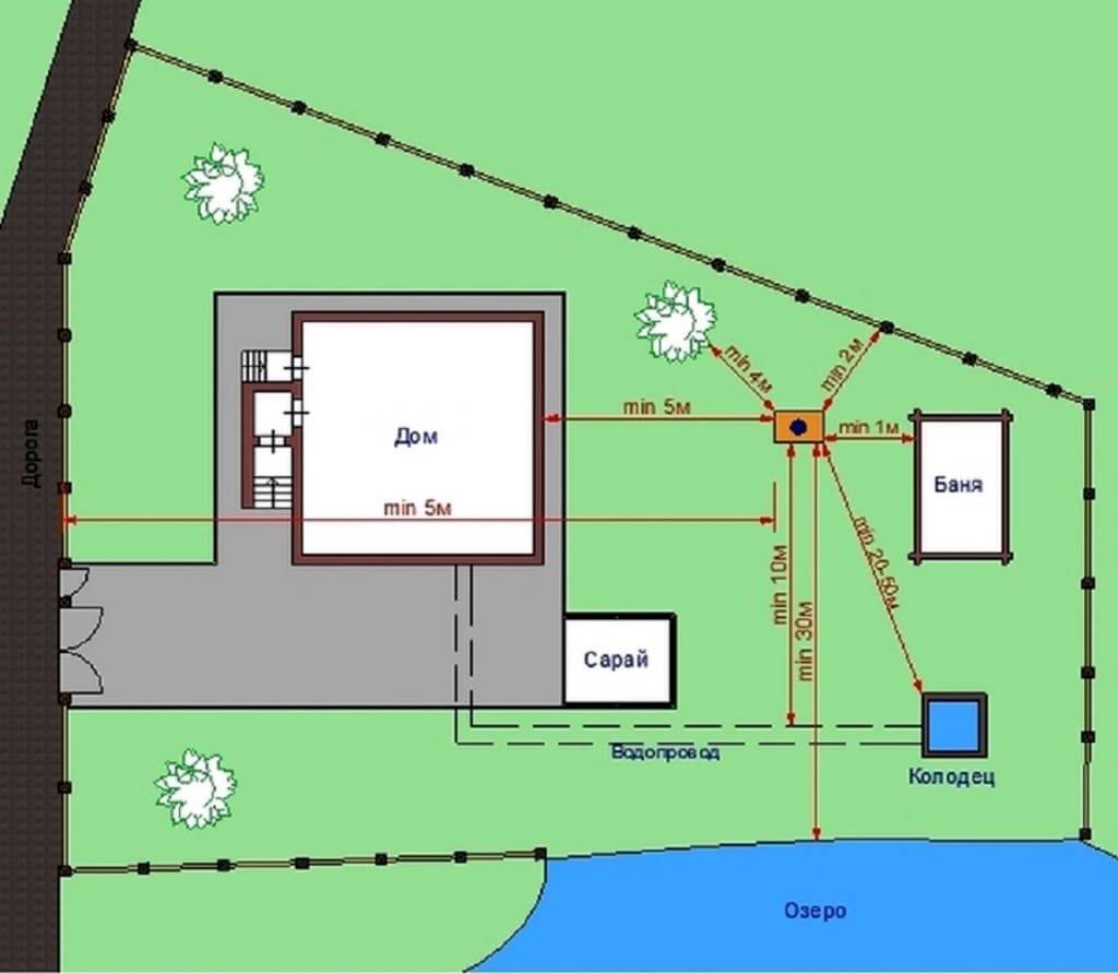 - если предусмотрена выгребная система, то место под постройку должно находиться не ближе 30 м от источника воды;