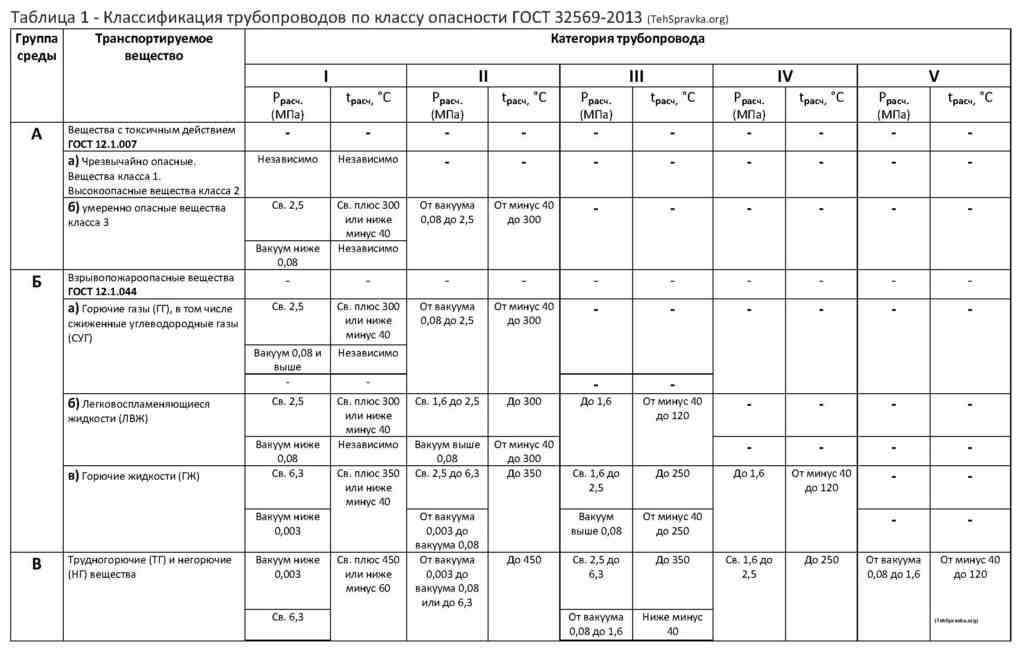 В зависимости от классификации перемещаемого вещества технологические трубопроводы группируются на три основные группы (А, Б, В) и пять категорий (I, II, III, IV, V). Таблица 1, по ГОСТ 32569-2013.