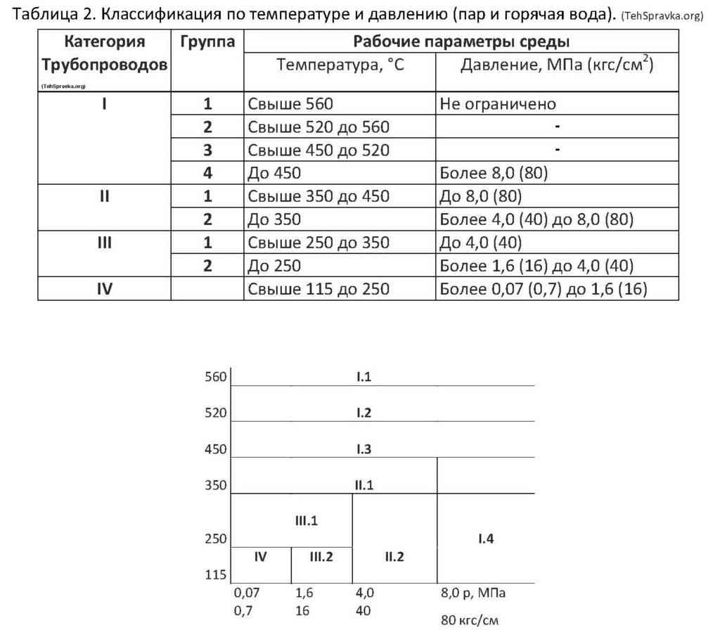 Согласно правилам (НП-045-03), трубопроводы пара и горячей воды в зависимости от рабочей температуры и давления, делятся на категории и группы, которые приведены в таблице 2.
