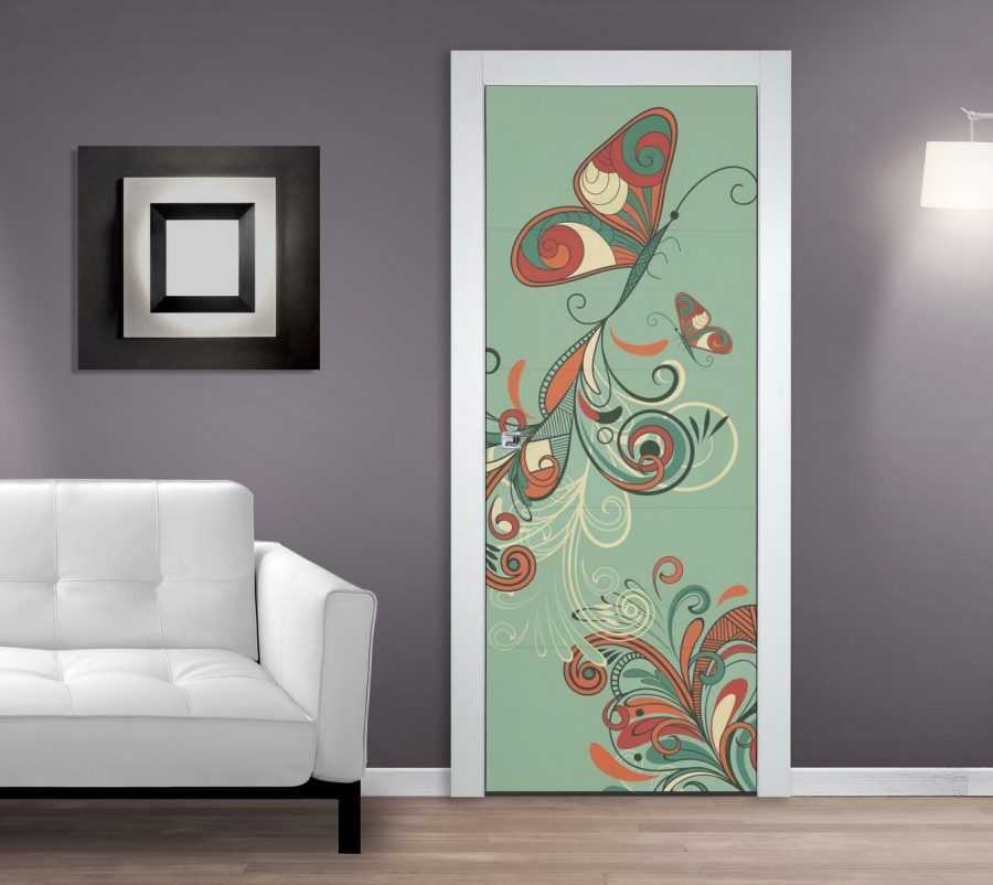 Еще один простой метод – декорирование дверей с помощью виниловых наклеек. Такой способ отлично подходит в том случае, если полотно в целом находится в хорошем состоянии и вам просто хочется внести в интерьер больше красок или увязать изделие с каким-либо предметом декора или мебели.