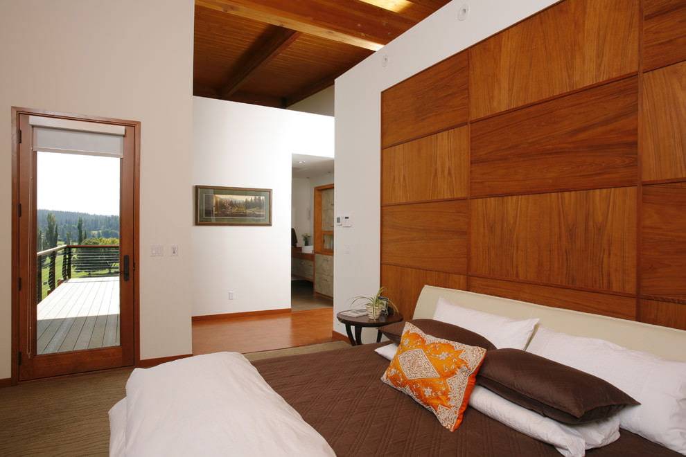 В зависимости от дизайнерской задумки в отделке спальни можно использовать реечные панели, плиты квадратной или прямоугольной формы, 3D-модели. Это помещение, в котором хочется расслабиться, успокоиться, отдохнуть, поэтому яркие, экспрессивные цвета, сложные конструкции, холодные поверхности не подойдут. Дерево же с его приятными для глаз оттенками, природным теплом, уютом будет оптимальным решением для оформления этой комнаты.