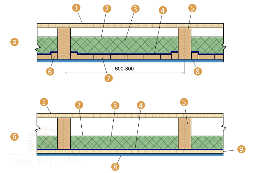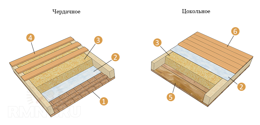 - Перекрытия подвальных помещений и цокольных этажей. В последующем снизу производится подшивка доской и укладка утепляющего материала. Сверху по балке устраиваются полы.