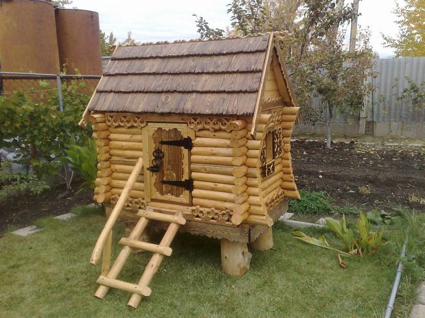 Простой проект детского домика из дерева может превратиться в сказочную избушку. В этом случае сложность строительства сопоставима с закладкой сруба для полноценного жилища: в результате образуется небольшое крепкое, устойчивое здание. Внутреннее помещение с трех сторон оснащается оконными проемами, здесь можно предусмотреть полноценные ставни.