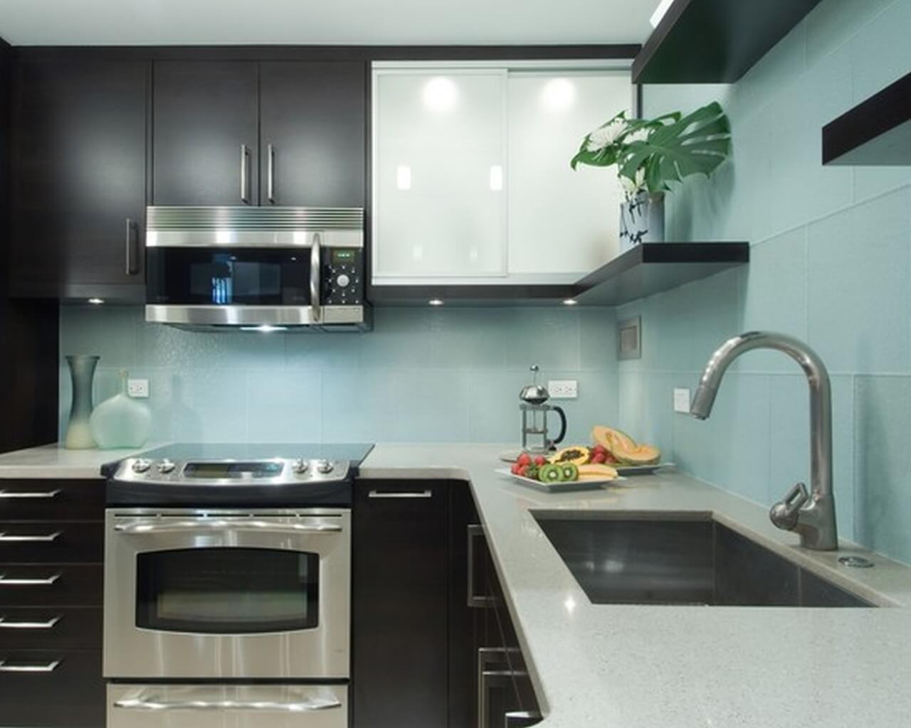 - Во-первых, вы можете выбрать небольшую модульную кухню с прозрачным дизайном, где мебель, стены и пол будут одного цвета. Здесь, однако, следует учитывать, что в один ряд расположенные шкафы со встроенным оборудованием могут перегружать небольшую кухню.