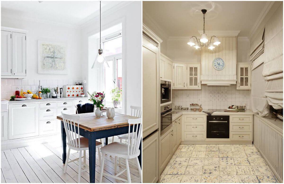 Мягкий и деревенский стиль, подразумевающий светлые и пастельные оттенки в кухонной мебели, впишется как в просторные помещения, так и в тесные. Прованс подразумевает встроенную технику, чтобы она не бросалась в глаза и не создавала впечатление высокотехнологичного современного пространства. Варочная панель, духовка, смеситель для кухонной мойки — все это должно иметь вид состаренных предметов.