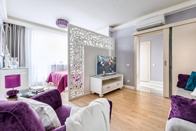 Одним из самых популярных планировочных решений, считается разграничение студии на спальную зону и гостевую с кухней, столовой, гардеробом и санузлом. Для отделения места для сна, в основном используют специальные перегородки, ширмы или арки.
