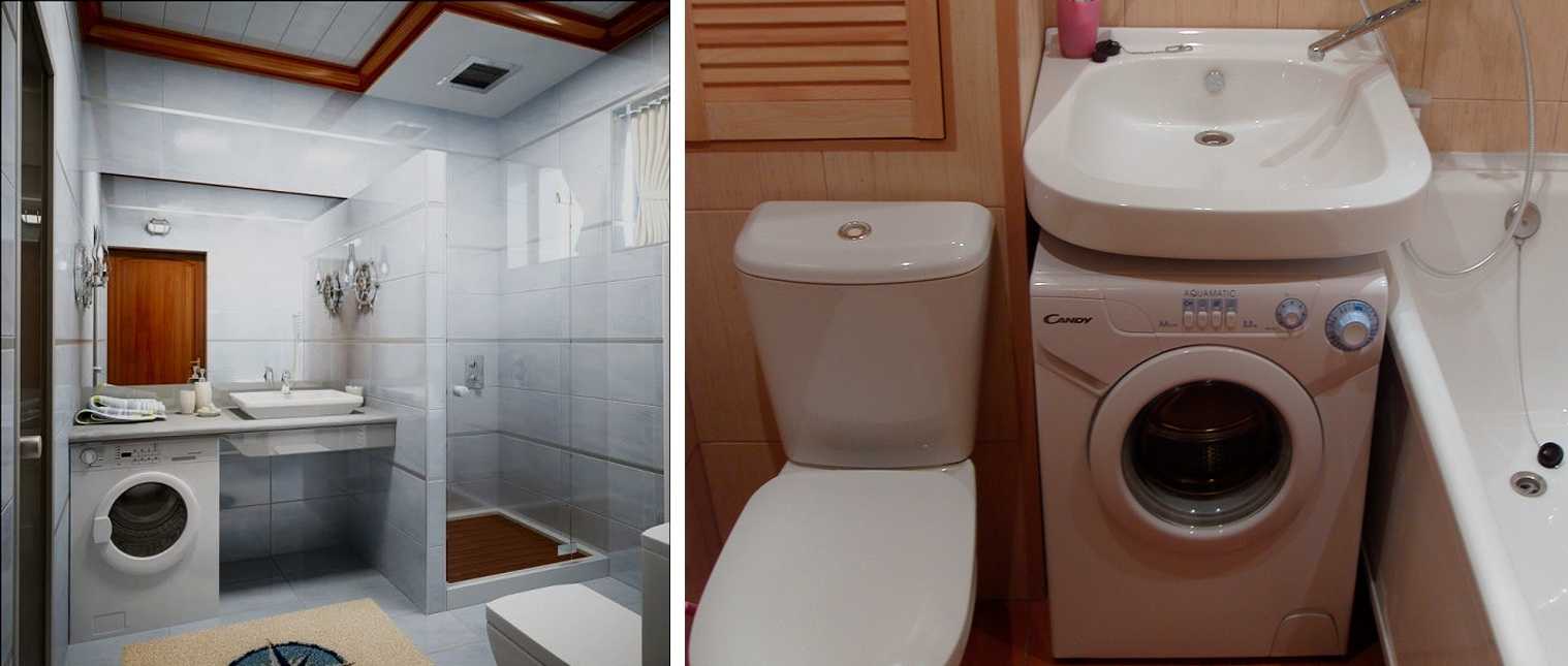 Только в таком варианте можно на два квадрата площади уместить и машинку, и унитаз, ванну с раковиной. Разве что найти такую модель, которая навешивается на стену над унитазом, но это — дорогостоящая экзотика.