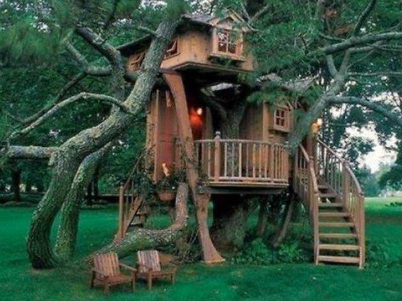 Обычный домик на дереве может превратиться в фантастическое место, если дополнить его качелями, горкой или песочницей. Ничего не мешает сделать из него игровой комплекс, включающий в себя несколько этажей или площадок, соединённых мостиками или лестницами. Домик с таким дизайном будет прекрасно смотреться на площади, где земля неровная (с оврагами и склонами).