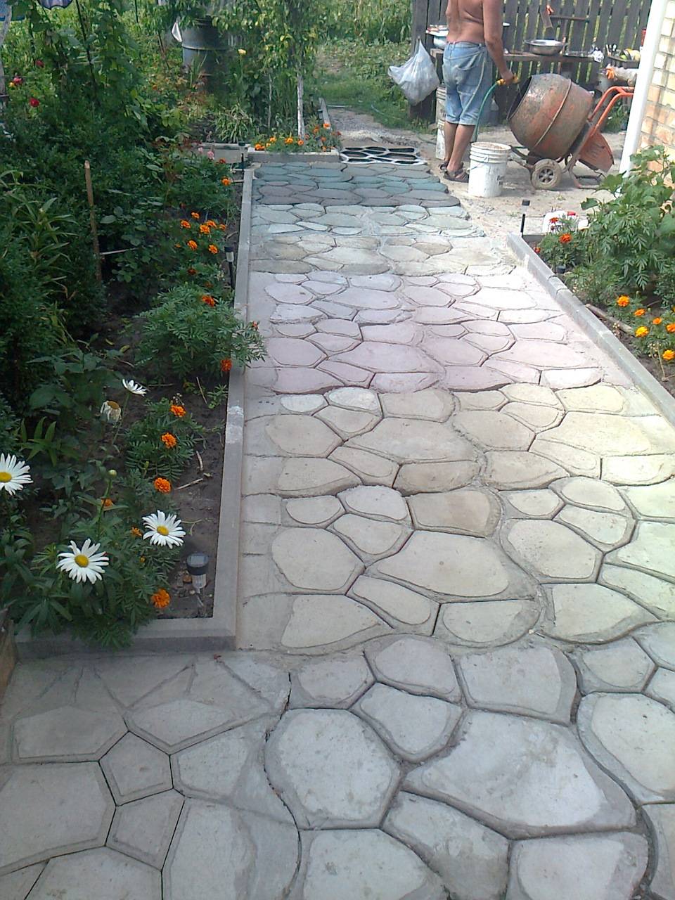 Лучше выбрать цемент не ниже М300, песок можно взять речной, щебенку размером 10-20 мм. Оптимально подходит гранитная. Если нагрузка на тропки большая, то можно взять более крупную фракцию щебени в 40 мм. Смешивать все ингредиенты удобно в бетономешалке или растворосмесителе, но при их отсутствии подойдет любая емкость типа корыта или же просто большой стальной лист. Сначала смешивают песок и щебень, потом добавляют цемент, получается серая масса. После этого добавляют половину из необходимого количества воды, перемешивают, а потом понемногу доливают остальную воду, чтобы состав стал нужной консистенции.