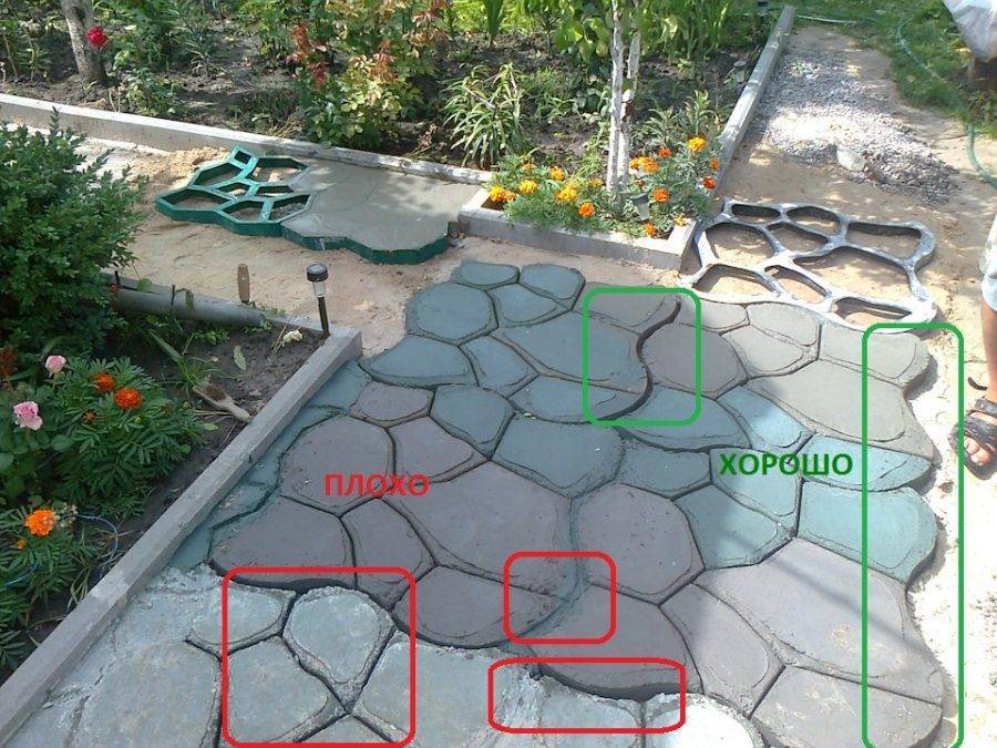 Есть схема, не требующая уплотнения, однако она подразумевает использование крупной формы. Сразу располагают емкость в выбранном месте, заливают в нее приготовленную смесь, контролируя, чтобы не появлялись пустоты в материале. Допустимо сочетать красители различных тонов, «подгоняя» вид плитки под общее восприятие участка.