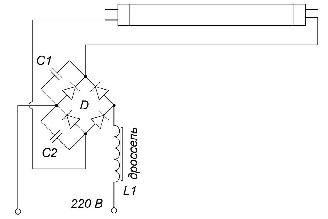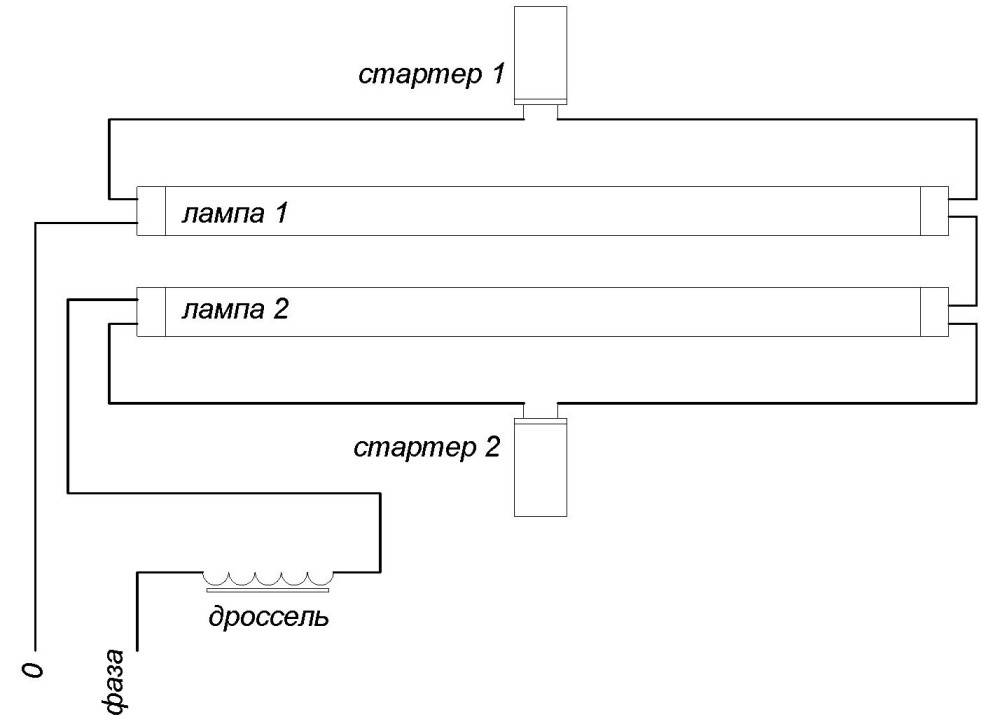 Дроссельная схема включения люминесцентных источников освещения отличается простотой и высокой надежностью. Исключение составляет регулярная замена стартеров, поскольку в их состав входит группа размыкающих контактов для формирования импульсов запуска.