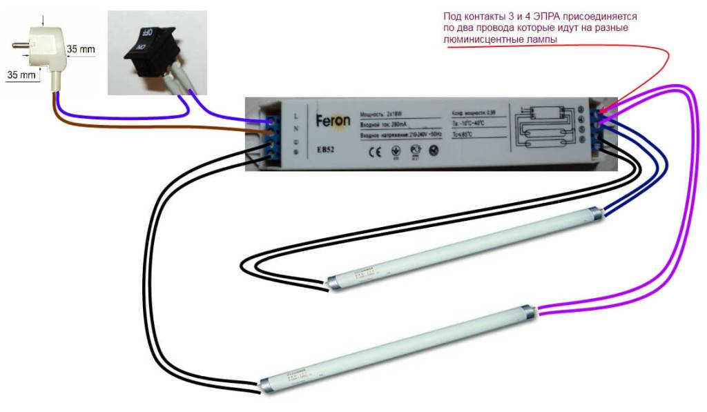 К этому ЭПРА можно подключить четыре люминесцентных лампы с рабочим напряжением 220 В