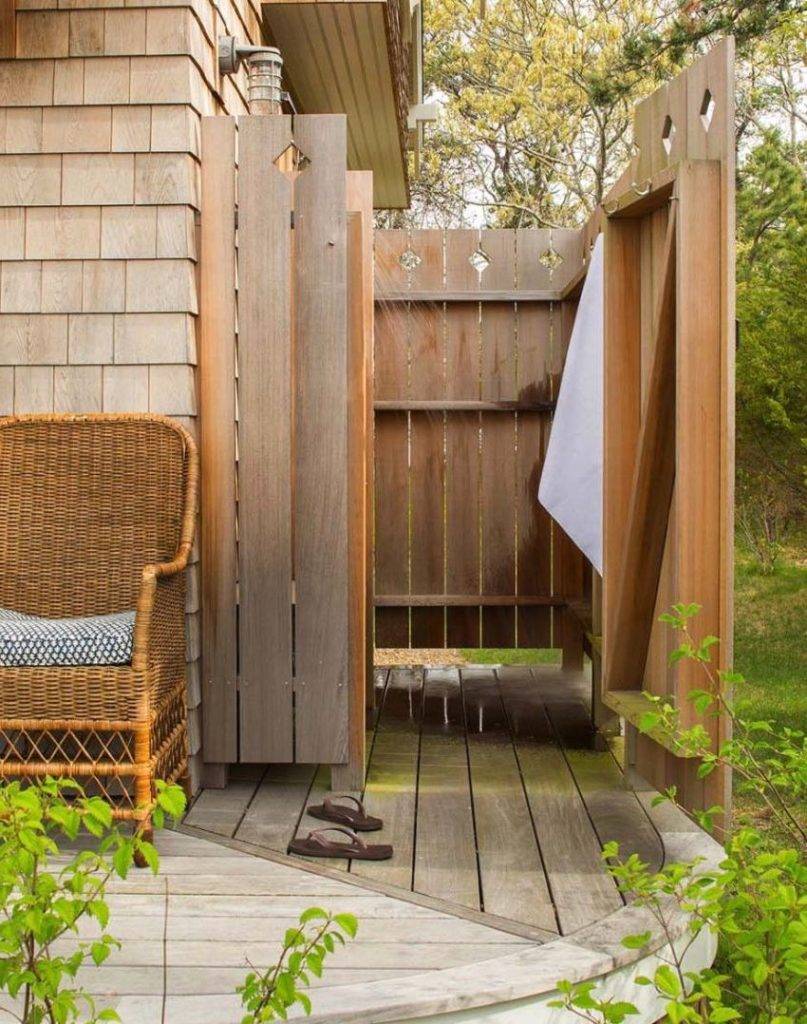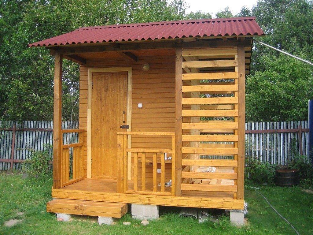 Деревянная кабинка – популярный и распространенный вариант. Это связано с тем, что она очень проста в исполнении. Для строительства используется экологически чистый материал, который обладает многими достоинствами. Единственный недостаток – низкая устойчивость к влаге и насекомым. Поэтому деревянные элементы подвергаются обработке антисептиками. Для строительства используют брус и доски. Оптимальным вариантом станет древесина хвойных пород, так как она обладает высокой устойчивостью к влажной среде.
