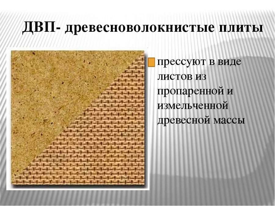 Древесноволокнистая плита или сокращенно ДВП представляет собой прессованный листовой материал, в котором древесные волокна связаны специальным наполнителем. Иногда используется термин фибролит, который объединяет разные типы древесноволокнистых материалов.