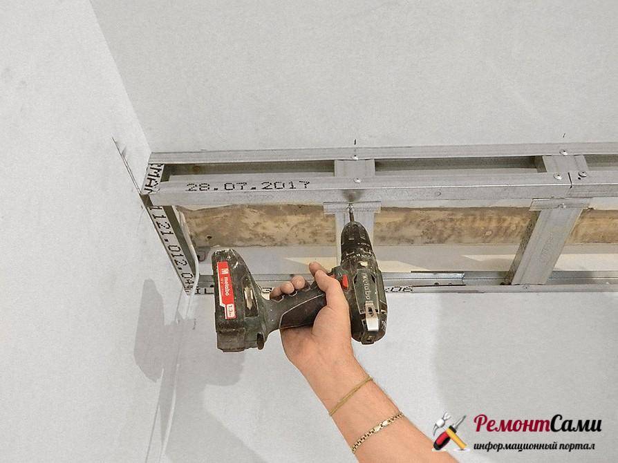 — подготовленные отрезки профиля следует вкрутить в профиль на потолке. Фиксировать его следует примерно через каждые полметра;