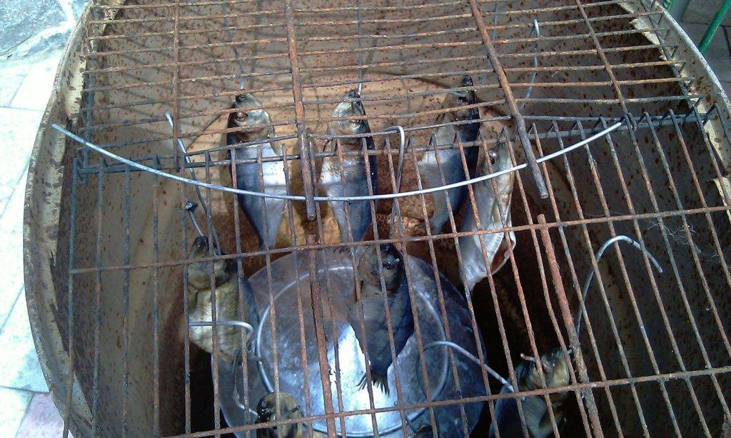 - на размещенные во втором ведре шампуры укладывают мясо или рыбу для копчения, закрывают крышкой;