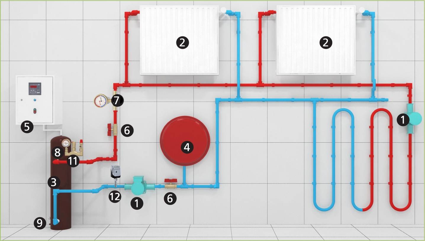 - котёл с расширительным баком — нагревает теплоноситель;
