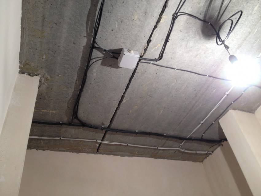 На потолке кабель можно прикрепить непосредственно к перекрытиям или спрятать в их пустотах (с оформлением отверстий ввода/вывода), а после закрыть все декоративным потолком.