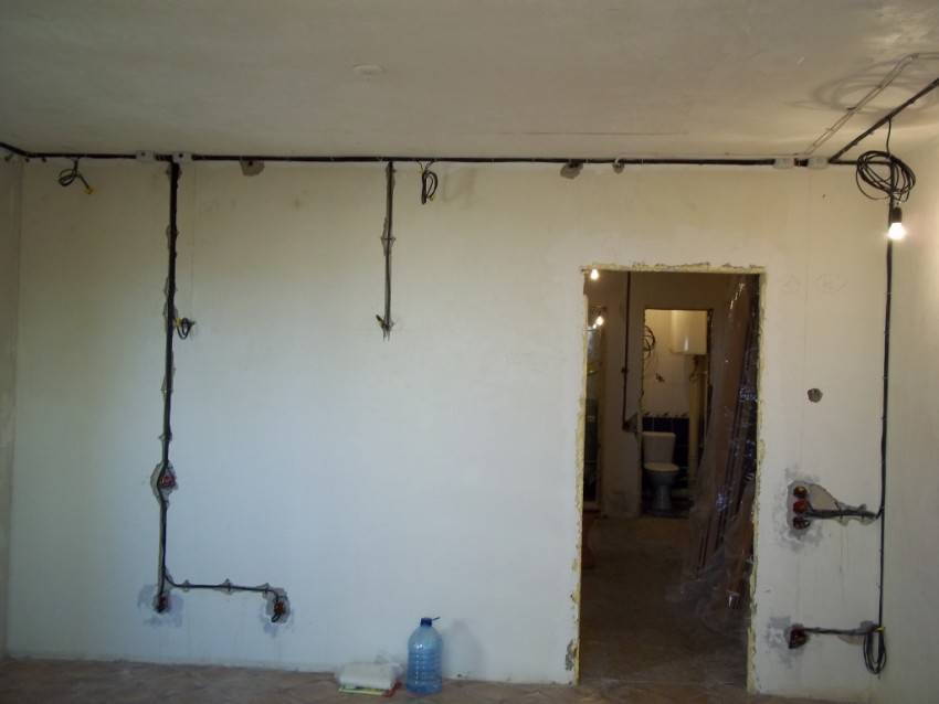 Перед расчетом количества кабельной продукции продумайте способ укладки электропроводки. Оптимальный вариант – развести проводники за потолочной и стеновой обшивкой из гипсокартона, в полу или под плинтусом. Такой подход позволит уберечь коммуникации от повреждений при последующих ремонтах и легко реализуется в однокомнатных и двухкомнатных квартирах панельных домов.