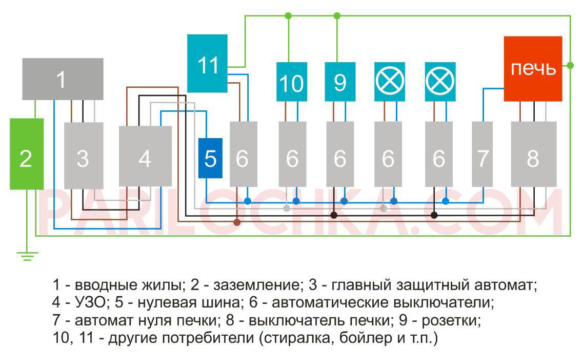 Рядом с электрическим щитком желательно повесить схему электропроводки строения. Не рекомендуется забывать о подключении УЗО: они отключают источники питания, если те по какой-то причине контактировали с водой. Это позволит спасти жизни посещающих баню людей. От возгорания обезопасит устройство защитного отключения с током отсечки. Все жилы в клеммниках должны быть прочно зафиксированы, чтобы избежать нагревания участка из-за неплотного зажима.