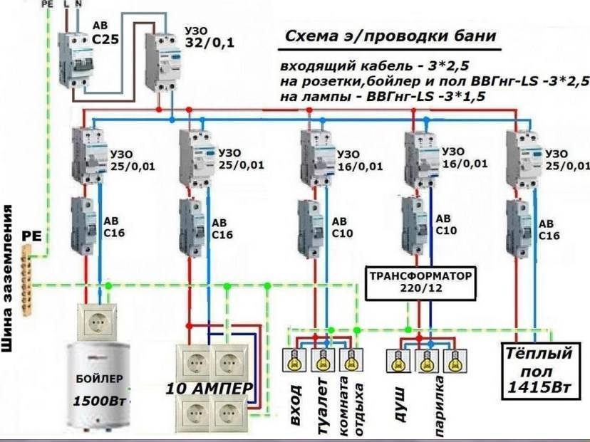 ВАЖНО! Не воспринимайте эти схемы как некий общий случай, его просто нет. Ориентируйтесь на свои представления о безопасности — от этого зависит количество автоматов и УЗО, на количество и мощность потребителей, на то, какая система заземления принята в местности, где стоит ваша баня.. Если захотите сделать цепь с напряжением 12, 24, 36 вольт, ставьте трансформатор в группу освещения — ее можно поделить на подгруппу потребителей 220 В и подгруппу низкого напряжения, которая будет питать парилку (и, возможно, моечную)