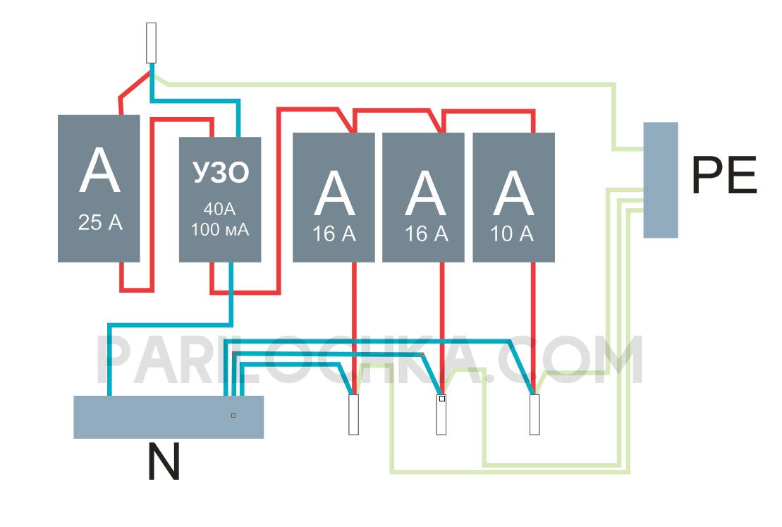 Рассмотрим подключение на 220 В. Вводный автомат на 25 А ставится на провод фазы. Далее на провода нуля и фазы ставится УЗО (40А, 100 мА), после чего провод нуля подсоединяется к шине N. Затем на три группы потребителей ставятся три автомата — последовательно на провод фазы. К каждой группе потребителей с шин N и РЕ идет свой провод, так, чтобы к потребителю шло по три провода — фаза, нуль и земля. Ниже картинка, иллюстрирующая приведенную схему.