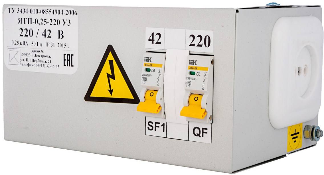 - Однофазное пониженное –напряжением 12-36 В запитывают светильники и светодиодную декоративную подсветку парилки и моечного отделения. Для получения такого напряжения используют специальный понижающий трансформатор типа ЯТП-0,25 220/36В;