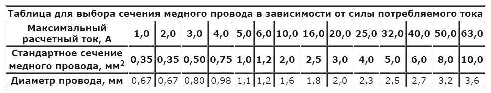 Толщина кабеля зависит от будущей нагрузки, однако сразу рекомендуем брать сечение с запасом. Вы уже знаете, как вычислять силу тока (делим мощность на сетевое напряжение), теперь в таблице найдите подходящее сечение (не забывая про запас):