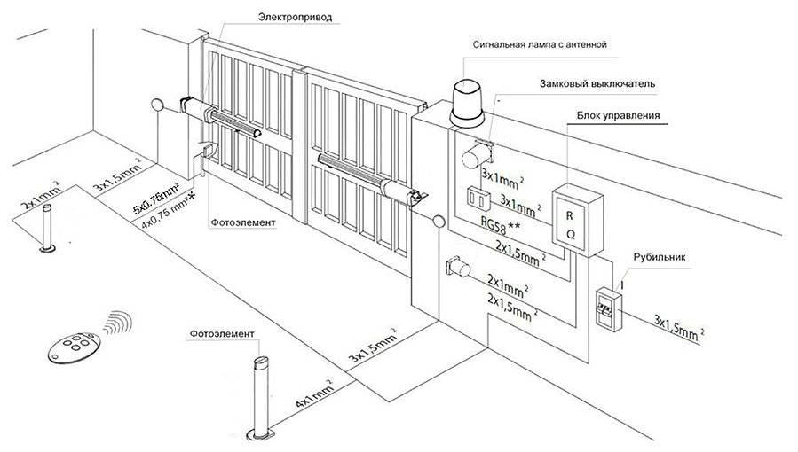 Она монтируется только в защитной «оболочке» – гофра, кабель-каналы. Для подключения рекомендуются кабеля с жилами от 1,5 «квадратов», причем к приводу их должно подводиться не менее 4-х (хотя бы 1 – как резерв на случай обрыва одной из линий). Если подходить к вопросу эл/монтажа рационально, то для каждого направления нужны индивидуальные расчеты, в первую очередь, в соответствии с потребляемой мощностью. Это касается случаев, когда обустройство системы автоматики производится из отдельных элементов.