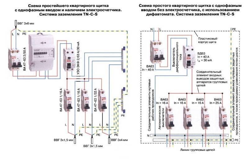 Стоит заметить, что все нижеприведенные схемы предназначены именно для однофазных квартирных щитков непосредственно расположенных у вас в квартире. Предполагается что щиток учета со счетчиком и вводным автоматом уже стоит в этажном щите. Соответственно его изображение на схемах не присутствует.