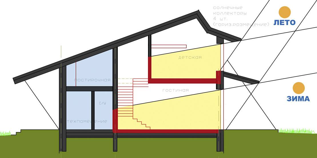 Обязательно стоит учесть расположение дома относительно солнца, чтобы использовать по максимуму естественное солнечное освещение вместо электрического. На рисунке показана возможность использования солнечного тепла в зависимости от времени года.