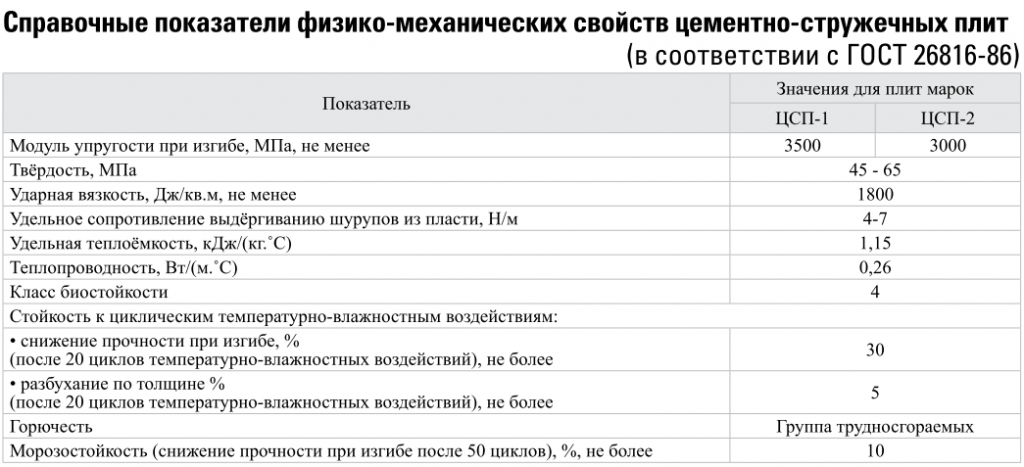 Материал отличается сравнительно небольшим весом, после обработки показывает хорошую био- и влагостойкость, морозоустойчив, паронепроницаем и устойчив к высоким температурам. При производстве не используются какие-либо синтетические разновидности сырья, поэтому ЦСП плиты считаются экологически чистыми.