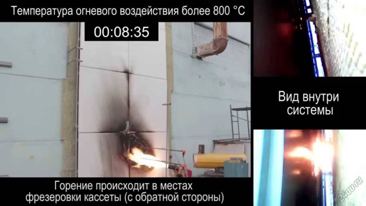 Производители стальных композитных кассет любят устраивать на объектах, где идет выбор облицовки, такое показательное шоу: ставят две газовых горелки на высоте метра от земли, напротив устанавливают две композитных кассеты, алюминиевую и стальную. Включают горелки, засекают время.