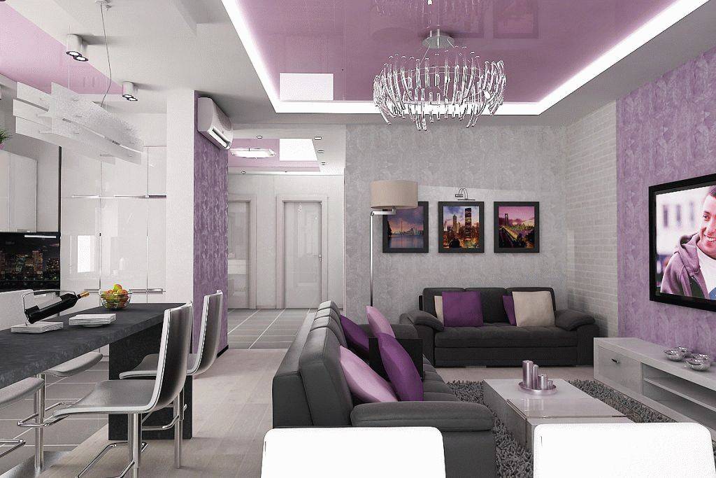 Потолок в серо-фиолетовой гостиной предпочтительно сделать в традиционном белом цвете. Подчеркнуть фиолетовую направленность интерьера можно при помощи дизайнерской люстры с сиреневыми цветами или светодиодной лавандовой подсветки по периметру потолка. Так акценты будут расставлены более удачно с эстетической точки зрения.