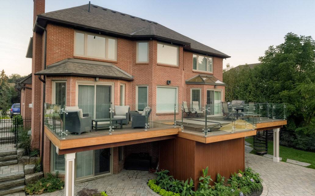 Большой двухэтажный дом из кирпича с двумя открытыми террасами с элементами стиля модерн