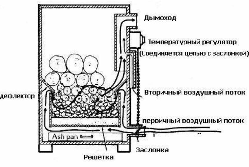 - заложенные в бункер дрова попадают в топку и сгорают;