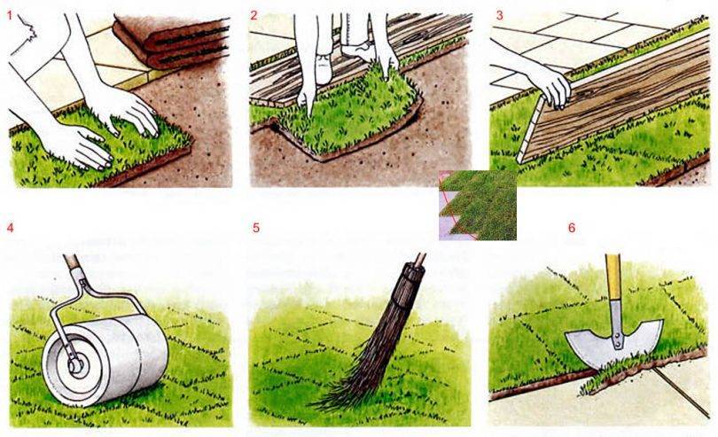 Травяные рулоны раскладывают в шахматном порядке строго по прямой линии. Их края должны сходиться максимально плотно.